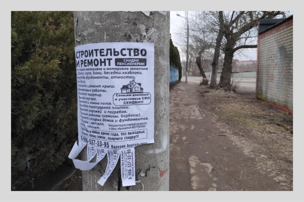 Ещё город живёт подсобными хозяйствами и мелким бизнесом: это магазины электроники, шиномонтажные мастерские, строительные работы. Почти на каждом столбе или заборе — объявления частников: «Продам картофель», «Парикмахерские услуги», «Развал-схождение». На одном из объявлений приписка: «Участникам СВО и ветеранам — скидки».