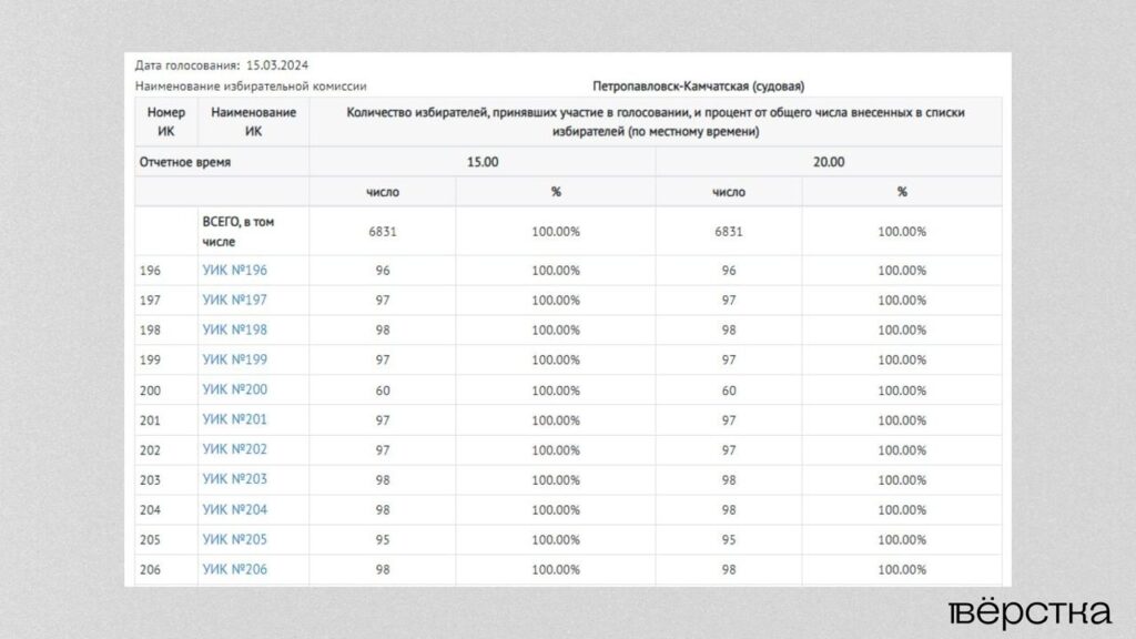 В первый день выборов президента более чем на 400 избирательных участках на Дальнем Востоке явка составила 100% избирателей, следует из данных избиркомов Приморья, Камчатки, Чукотки, Магаданской области и Сахалина, которые проанализировала «Вёрстка».