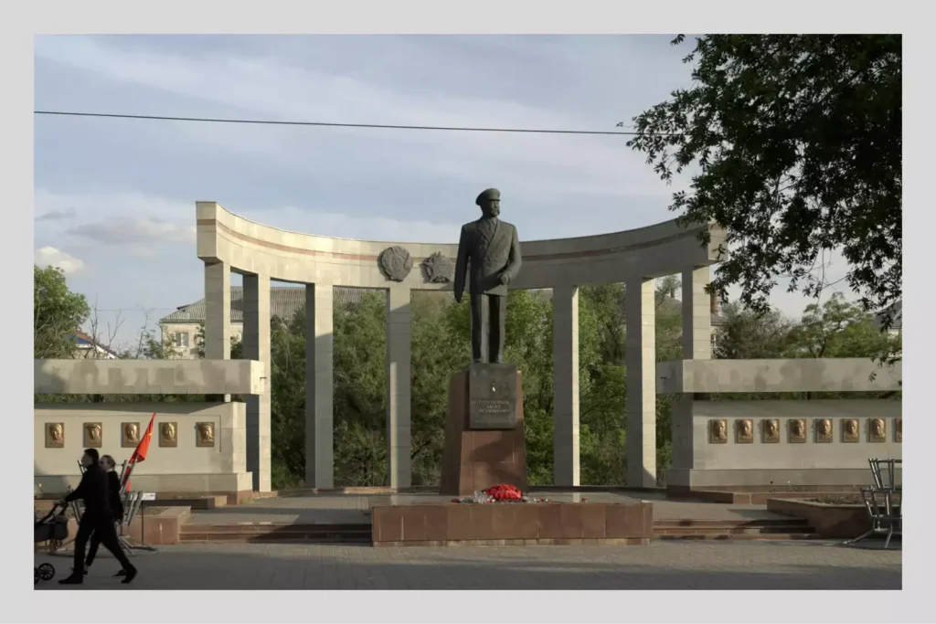 В сквере напротив гостиницы «Элиста» высится циклопический памятник генерал-лейтенанту, герою Великой Отечественной Басану Городовикову. По одну сторону от бронзового воина с пышными усами — барельефы с портретами героев Советского Союза, по другую — барельефы с героями Социалистического труда. Очередной анонимный представитель антивоенной интеллигенции назначает встречу на скамейке рядом с гигантом.