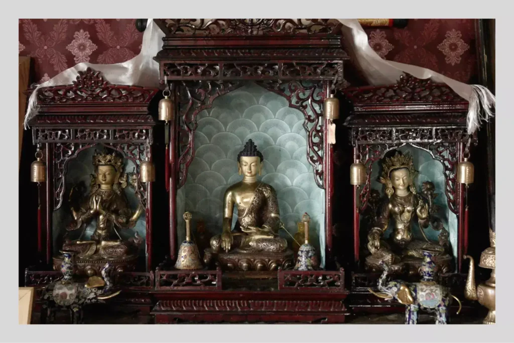 На верхнем этаже центрального хурула Калмыкии «Золотая обитель Будды Шакьямуни», одного из самых крупных буддийских храма Европы, стоит статуя Будды Майтреи. Верующие считают — когда эпоха войн и страданий закончится, он спустится из небесного сада радости на землю, за семь дней достигнет просветления и будет учить людей дхарме. Глаза статуи завязаны: над ней ещё не провели обряда «оживления» — наполнения молитвенными свитками и реликвиями, — сопровождаемого чтением сутр.