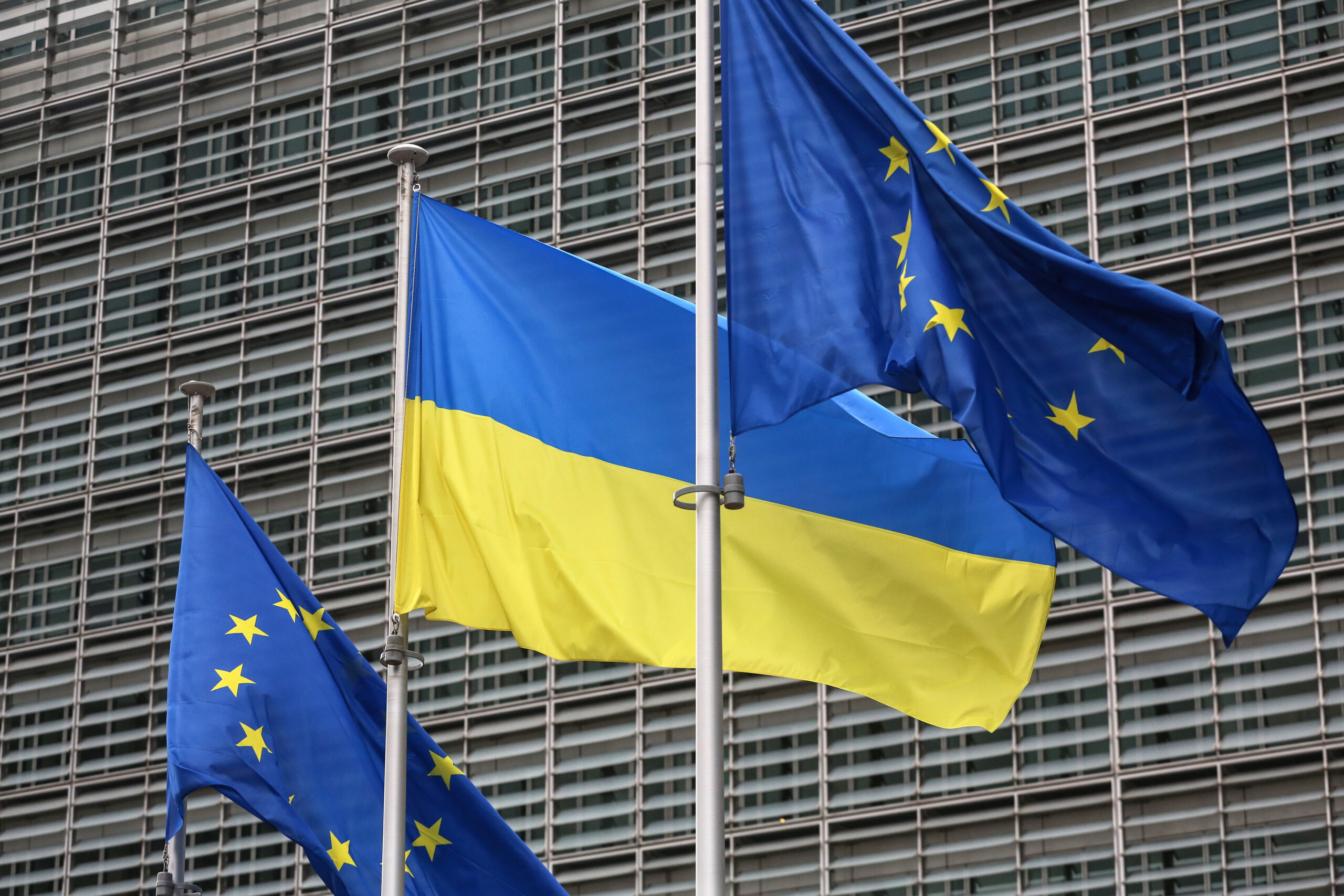 Фото: Флаги Евросоюза и Украины перед зданием Еврокомиссии в Брюсселе. Valeria Mongelli / Hans Lucas via Reuters