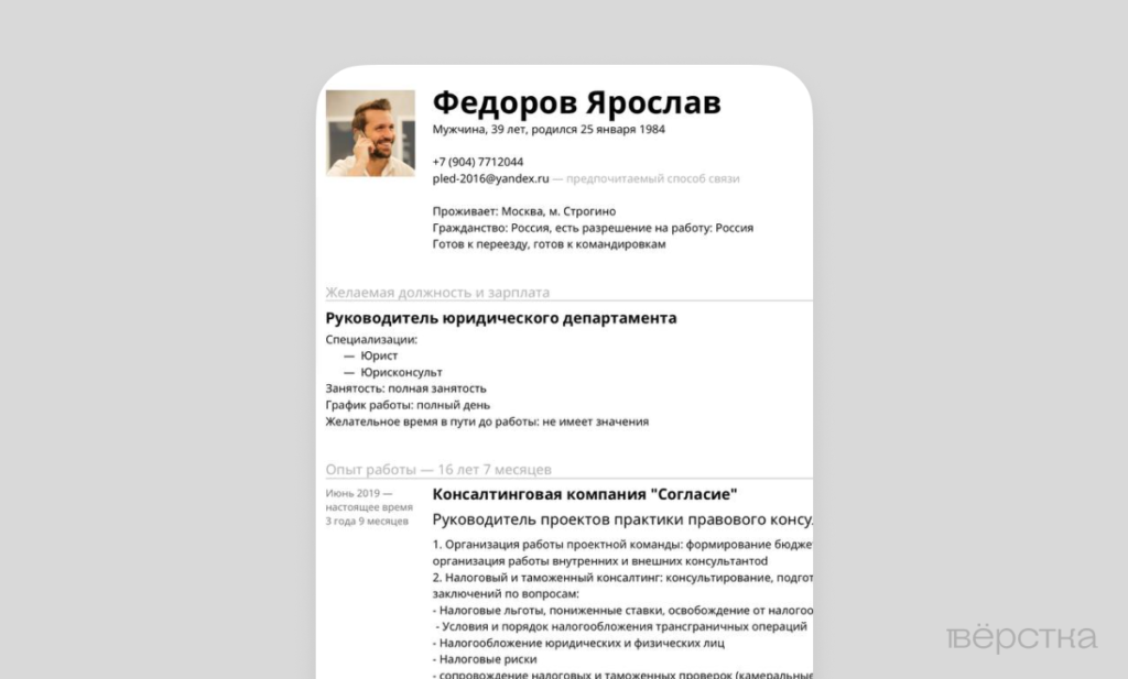 Опыт работы Ярослава я скопировала из своего настоящего резюме, на год уменьшив продолжительность работы в каждой компании — ведь Ярослав моложе меня.