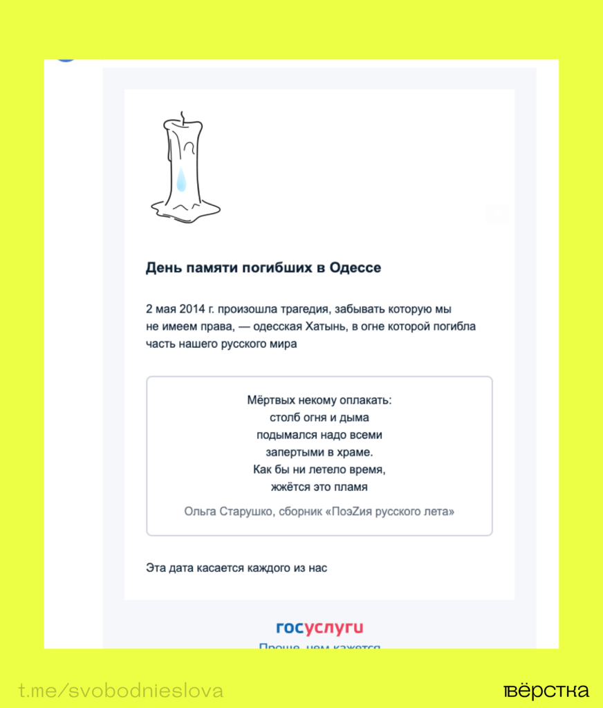 Вечером 2 мая пользователи «Госуслуг» получили рассылку со стихотворением Ольги Даниловой, приуроченным к событиям в одесском Доме офицеров в 2014 году. Речь о столкновении между проукраинскими и пророссийскими жителями, в результате которого погибло 48 человек. Российская пропаганда представила столкновения как «геноцид» русскоязычного населения и вплоть до полномасштабного вторжения использовала для оправдания необходимости войны.