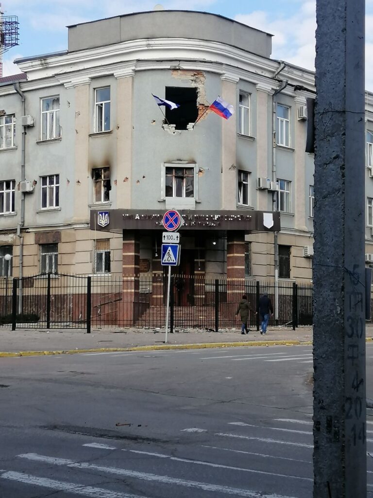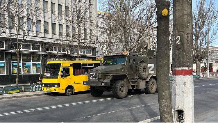 Когда русские военные прошли мост, они собрались в колонну, как на 9 мая, и пошли по городу с БТР и боевыми машинами. Это «шествие» длилось несколько часов. По дороге они убили несколько гражданских людей — их трупы потом ещё несколько дней лежали на тротуарах. В городе как будто вымерло всё, даже собаки не бегали. Большинство людей успели запастись продуктами, и можно было не выходить из дома и притаиться. Русские заходили в ТЦ, грабили, выносили золото. Заняли государственные здания, сели в Белом доме, поставили военных и технику вокруг.