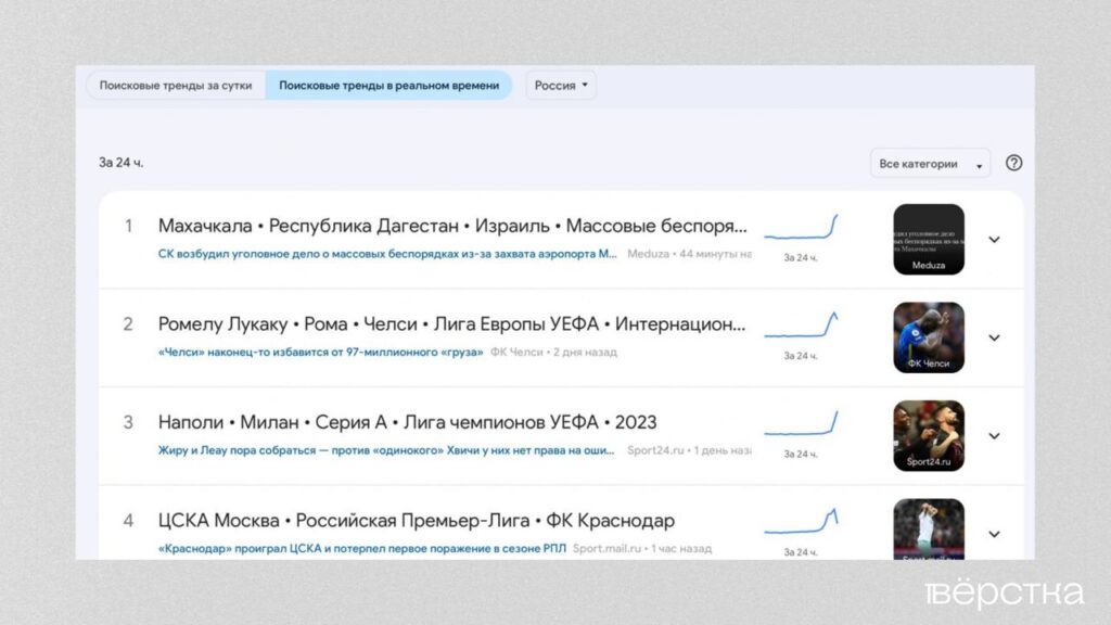 Тема протестов в аэропорту Махачкалы вышла в топ поисковых запросов согласно данным сервиса Google Trends, на которые обратила внимание «Вёрстка»