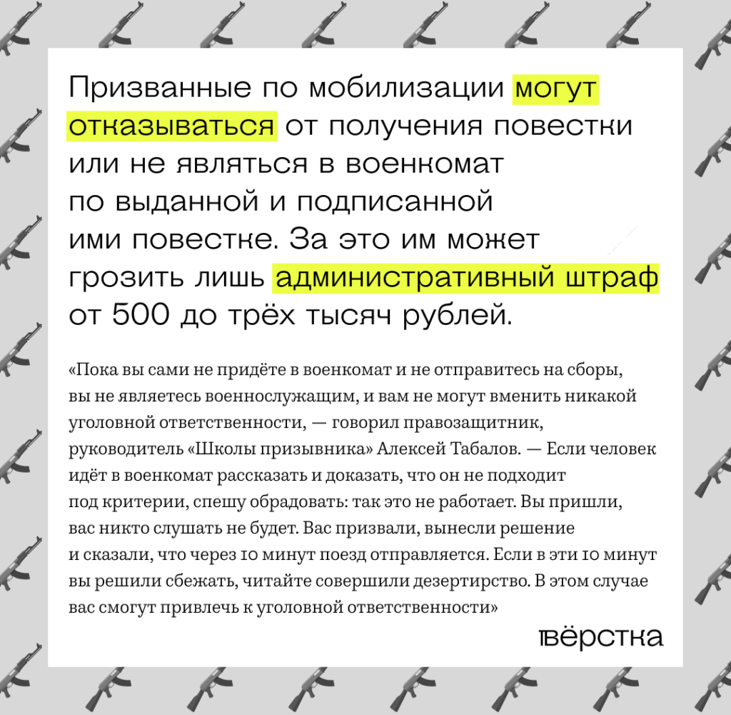 Также, по словам Миры, мужчина в форме сказал, что по повестке обязательно надо прийти в военкомат, иначе Алику грозит 10 лет тюрьмы, а «все вопросы к Путину». В действительности за неявку в военкомат грозит административный штраф.