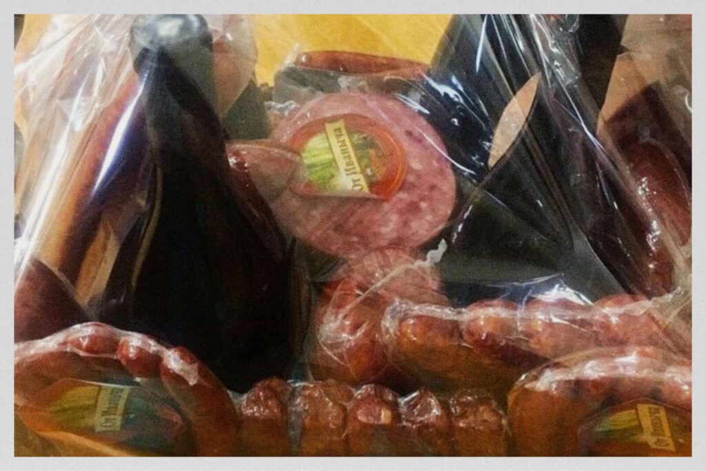 Корзинка с колбасой «От Иваныча» — традиционный подарок от президента «Роснефти» Игоря Сечина. Фото: Ведомости.