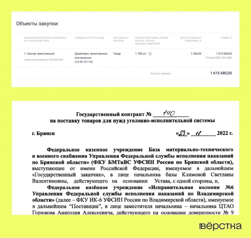 Также учреждение получило три тендера на пошив одежды — белья, маек и свитеров — и для заключённых. Общая сумма контрактов достигает почти 5 млн рублей. В рамках ещё одного контракта — от 28 ноября — колония Навального, помимо вышеупомянутых позиций, должна поставить ремни и полуботинки.