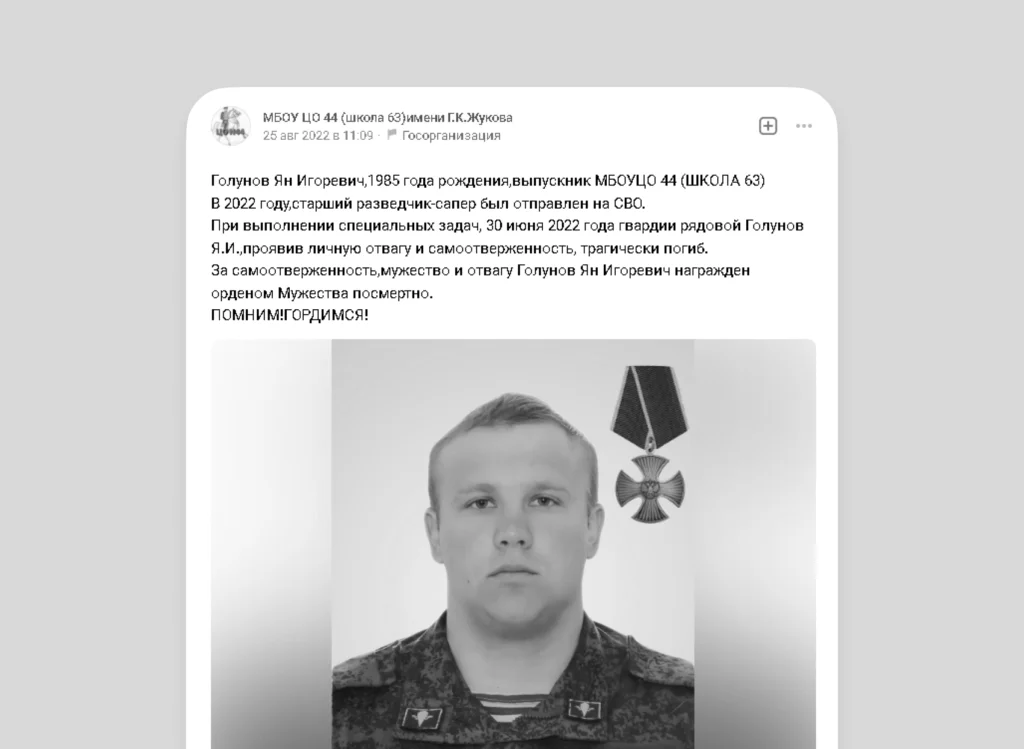 На официальной странице школы № 44 во ВКонтакте говорится, что старший разведчик-сапёр Голунов трагически погиб 30 июня 2022 года при выполнении специальных задач. За самоотверженность, мужество и отвагу его посмертно наградили орденом мужества.
