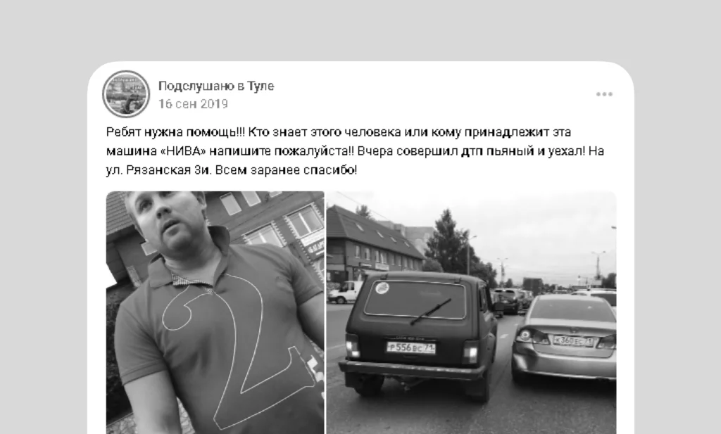 В 2019 году житель Тулы во ВКонтакте пожаловался, что виновник ДТП, в которое он попал, был пьяным и покинул место происшествия. На опубликованных фотографиях туляки узнали виновника ДТП — им был Ян Голунов.