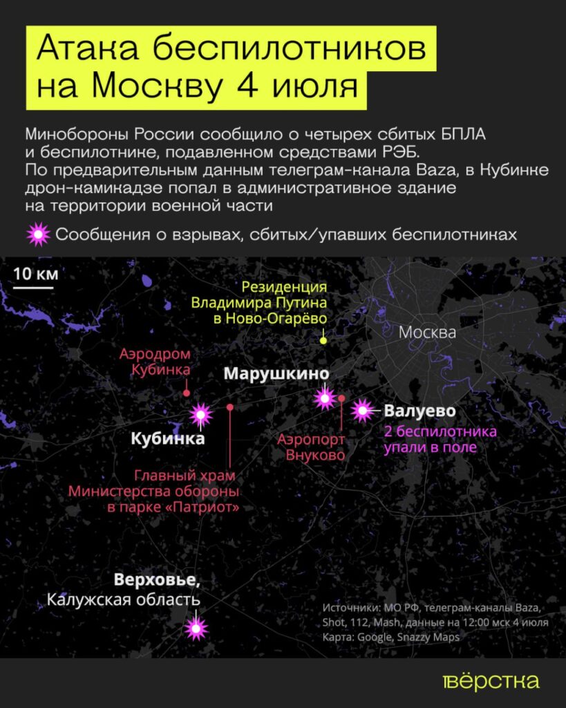 Так, один из БПЛА не долетел до Московской области около 5 км — его сбили около деревни Верховье в Калужской области. Один беспилотник атаковал подмосковную Кубинку, в которой находится множество военных объектов: военный аэродром, воинская часть, в которой базируется отдельный полк спецназа ВДВ, парк Патриот, а также храм вооружённых сил. По информации телеграм-канала Baza, атака была удачной — БПЛА попал в административное здание, из людей никто не пострадал. Ещё два беспилотника упали у посёлка Валуево в Новой Москве, а один БПЛА взорвался рядом с деревной Марушкино, примерно в километре от аэропорта Внуково, пишет телеграм-канал SHOT.