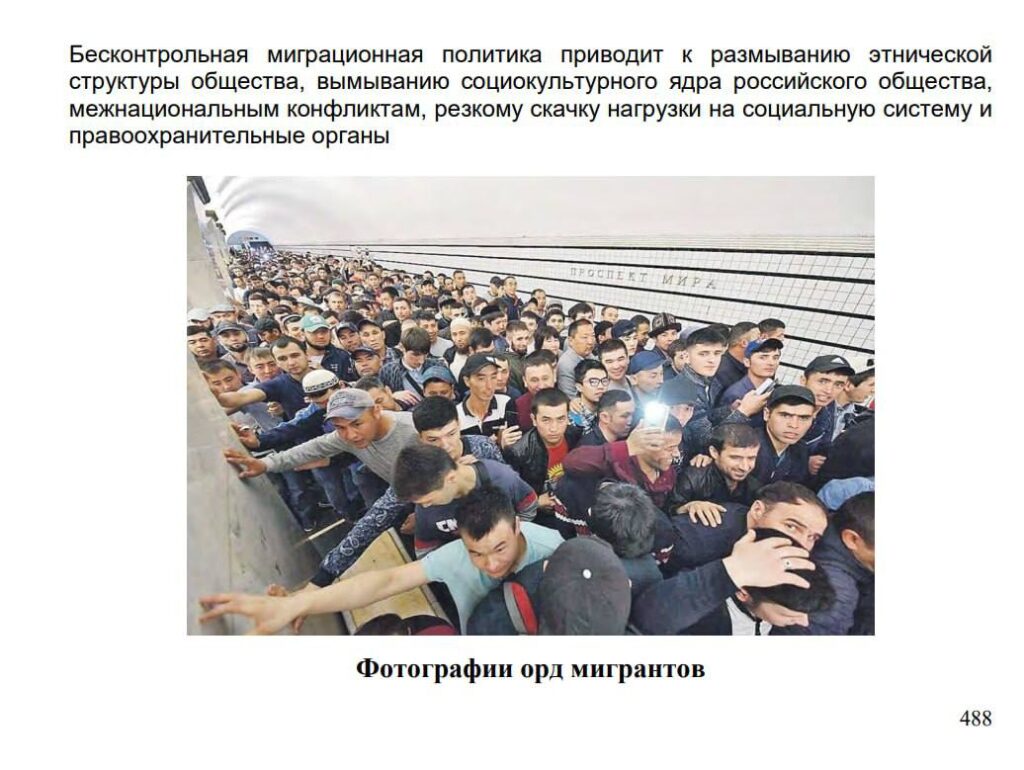 Глава «Социокультурные угрозы российской государственности» проиллюстрирована фотографией, озаглавленной «Орды мигрантов». В подписи к ней говорится, бесконтрольная миграция ведёт, помимо прочего, к «размыванию этнической структуры общества» и «вымыванию социокультурного ядра».