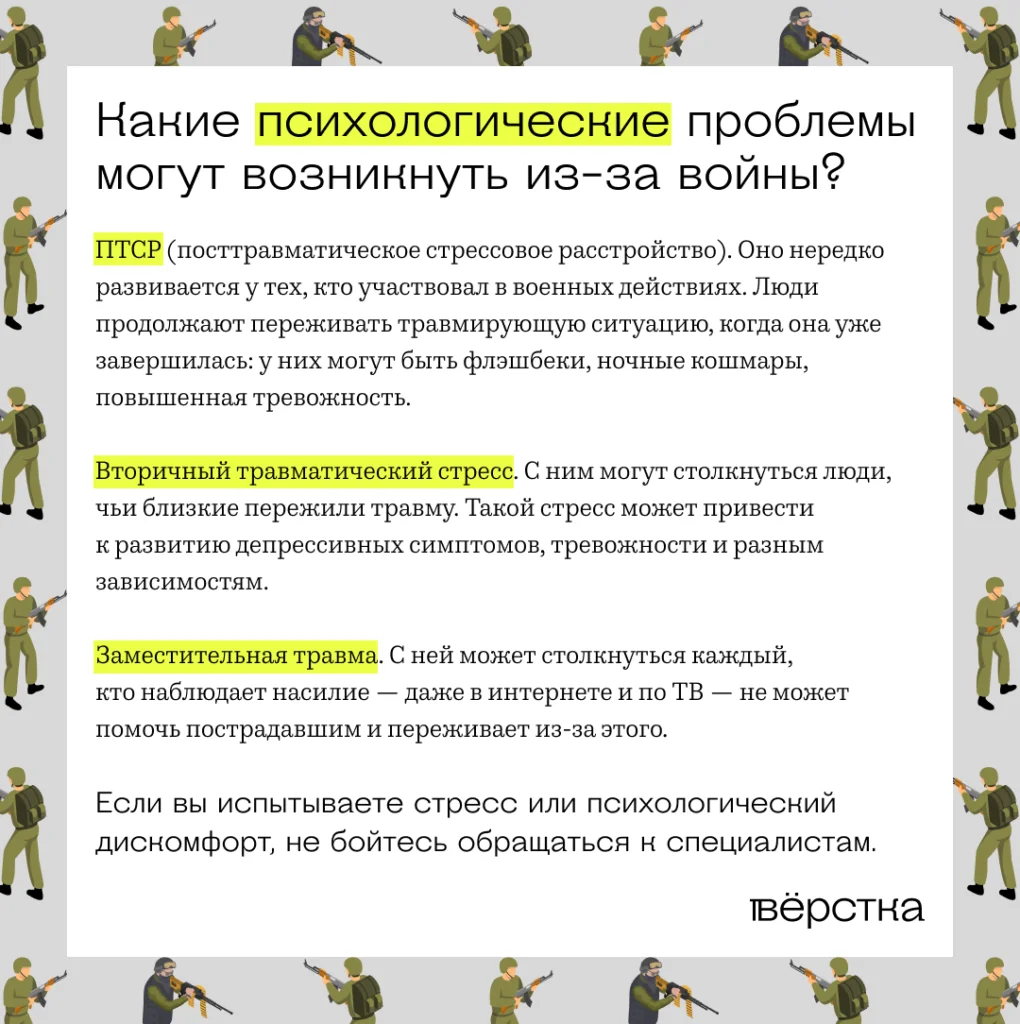 Невозможно сходить на войну и вернуться оттуда тем же человеком, которым ты был раньше. То, что там происходит, слишком сильно отличается от нормальной мирной жизни. Психике нужно адаптироваться к этим условиям, и она делает это по-разному. Поэтому возникают последствия — это может быть и ПТСР, и другие психологические следы.