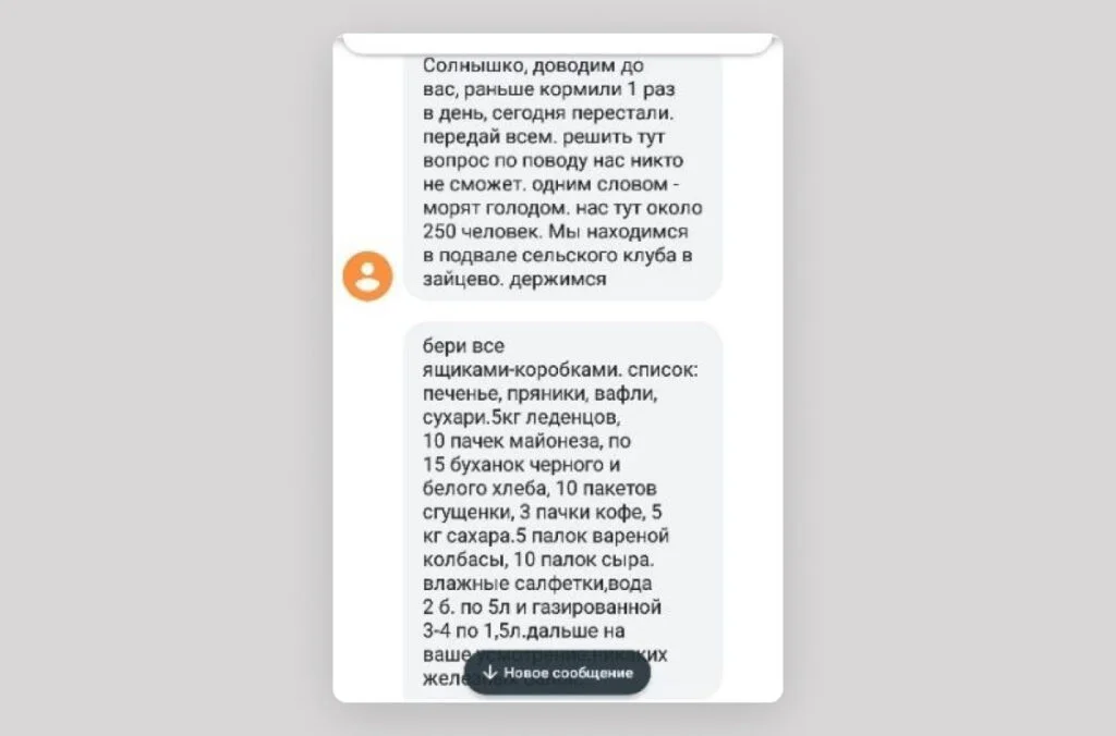 17 ноября их вывезли в Зайцево, и с тех пор мне приходят только смски. Звонки не проходят. Иногда сообщения приходили с незнакомого мне номера, но я понимала, что пишет мне мой муж — по ласковым словам, которыми он обычно меня называет. Жаловался на то, что редко кормят, присылал целый список продуктов.