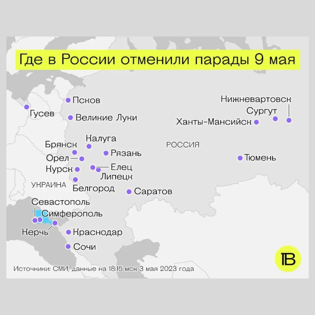 Кроме того, парадов не будет в удалённых от фронта Нижневартовске, Сургуте и Ханты-Мансийске. В мэриях городов утверждают, что хотят выразить «солидарность с другими регионами страны, где по соображениям безопасности уже отменили праздничные мероприятия».
