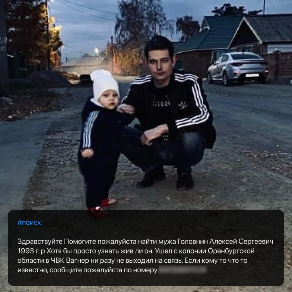В конце января она опубликовала пост о поиске Алексея в телеграм-канале «Не жди меня из Украины». Она указала полное имя мужа и год рождения, рассказала, что он ушёл воевать из колонии в составе ЧВК, и оставила свой номер телефона.