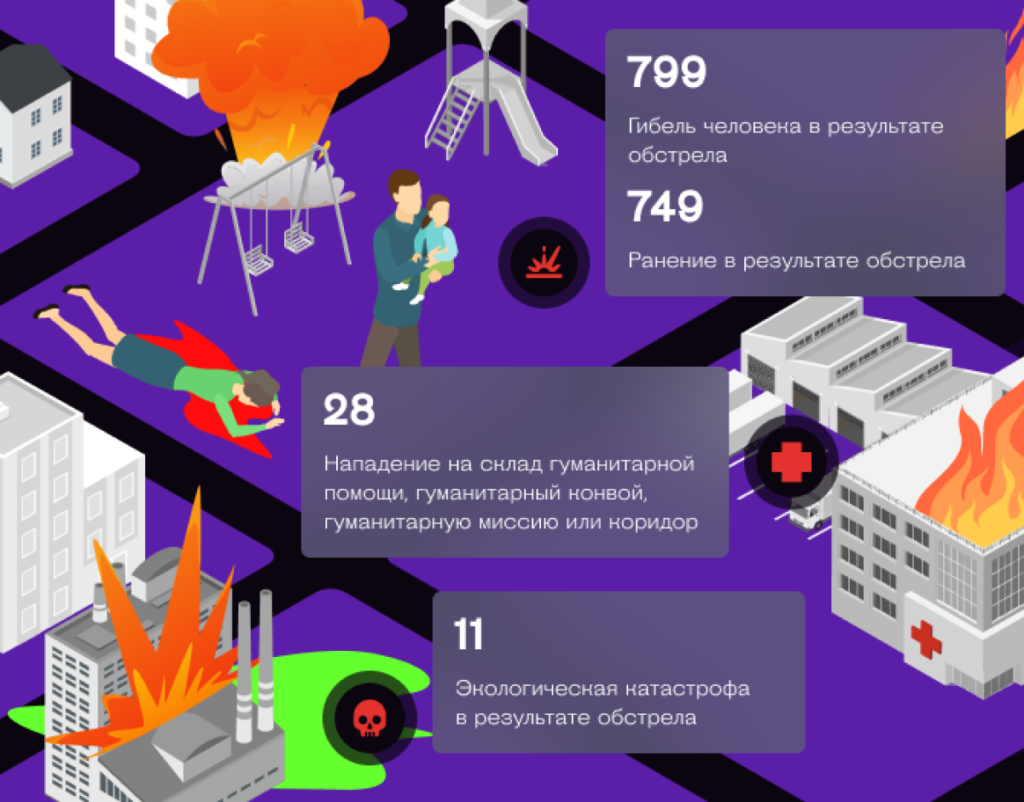 По данным движения, удары по историческим памятникам, зданиям больниц и госпиталей, образовательным и религиозным сооружениям наносились как минимум 720 раз. Кроме того, задокументировано не менее 605 случаев применения неизбирательного оружия. Речь идёт об ударах системами «Смерч», «Солнцепёк», «Буратино», а также кассетными бомбами. Кроме того, три раза сообщалось о применении химического оружия, в том числе фосфорных бомб.