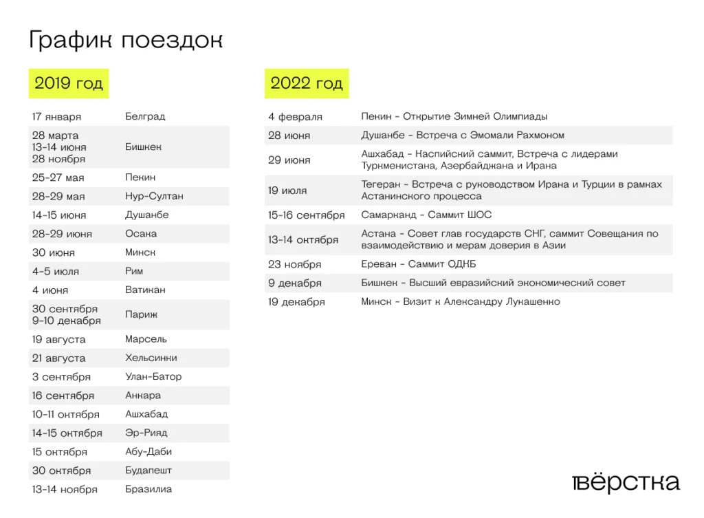 По сравнению с 2019–м количество поездок Путина как за рубеж, так и внутри страны сократилось почти втрое. В 2022–м он выезжал лишь 24 раза, и всего девять — за пределы страны. В 2019–м таких поездок было 62, из которых 22 — за пределы РФ, почти в половине случаев — в страны Европы.