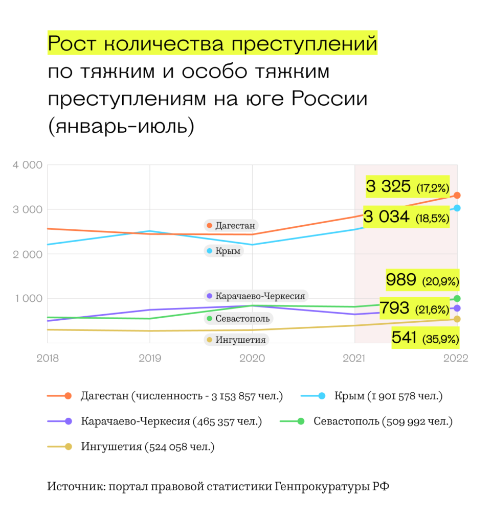 На юге России резко выросло количество тяжких и особо тяжких преступлений. На 17,2% — в Дагестане, на 20,9% — в Карачаево-Черкесии, на 35,9% — в Ингушетии, на 18,5% — в Крыму, на 21,6% — в Севастополе.