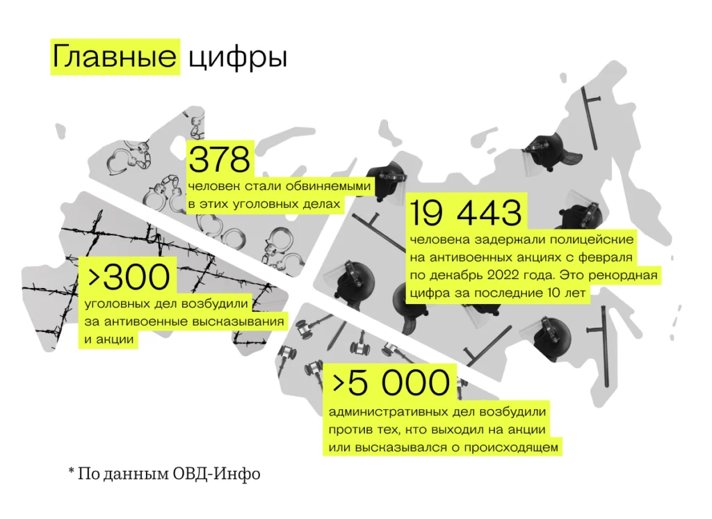 Цифры подтверждают активное сопротивление россиян: более 19 тысяч противников войны в 2022 году отправили в автозаки, более пяти тысяч — понесли административное наказание.