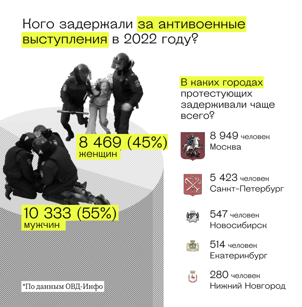 «Несмотря на то, что большая часть задержаний (порядка 17 тысяч — Прим. ред.) пришлась на первую и вторую протестную волну, остальные распределены равномерно в течение года, — говорит юристка „ОВД-Инфо“ на условиях анонимности. — Речь про одиночных пикетчиков и задержанных за дискредитацию армии из-за постов в соцсетях и других антивоенных действий. На самом деле, количество людей в России, настроенных против войны, больше, чем кажется. По нашим подсчетам, без задержаний с конца февраля прошло лишь 18 дней. То есть практически каждый день кто-то протестует против войны».