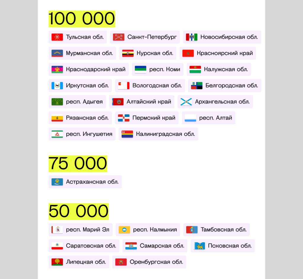 Самую большую сумму — в 500 тысяч рублей на человека — выделили власти Ханты-Мансийского автономного округа. Выплата разбита на две части, половину обещают перевести сразу после заключения контракта, а вторую — после его завершения.