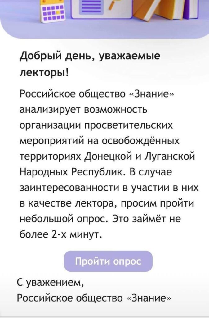 Руководитель школы добавил, что за несколько минут до интервью ему пришло письмо от Российского общества «Знание», где говорилось, что оно «анализирует возможность организации просветительских мероприятий на освобождённых территориях Донецкой и Луганской Народных Республик».