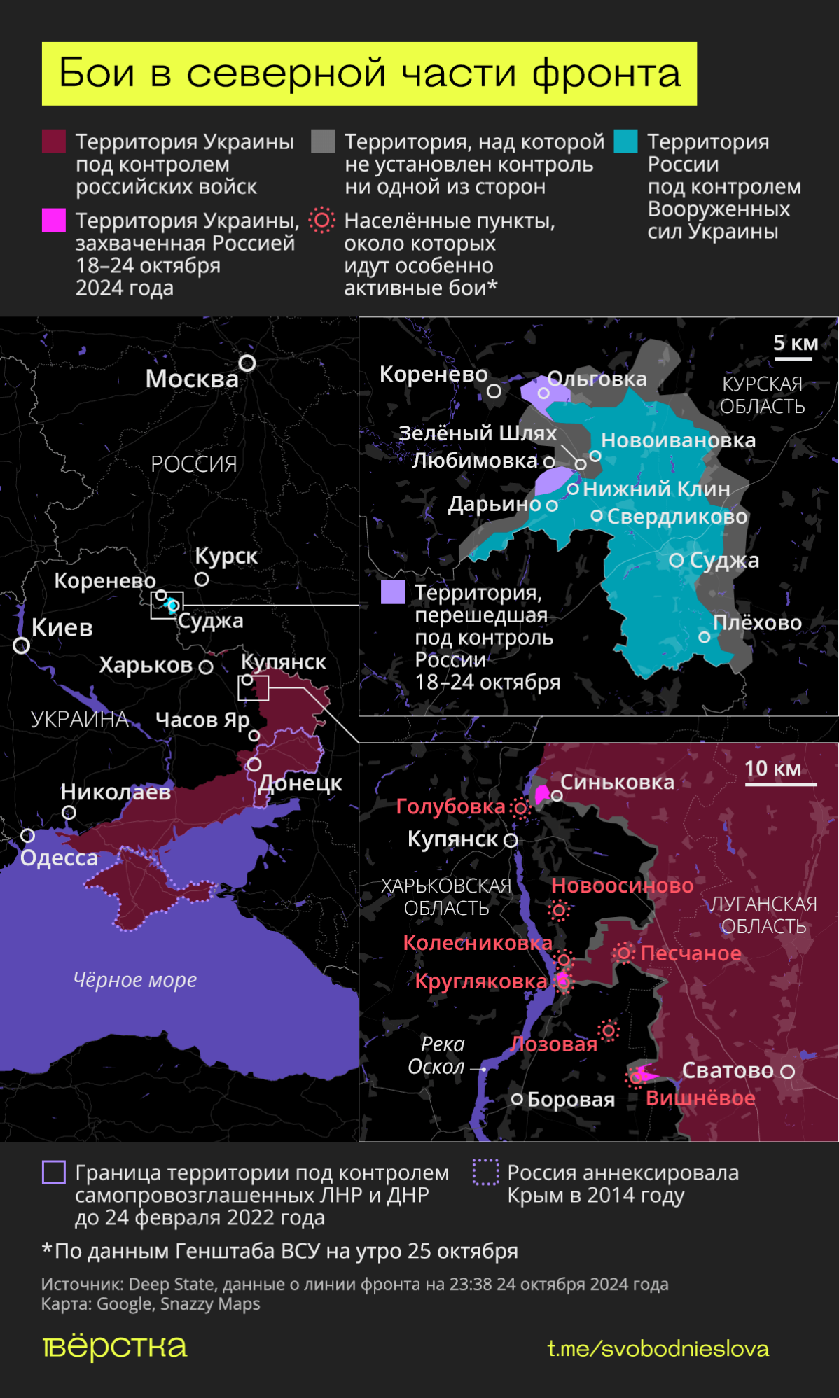 Российские военные продвигаются на покровском, кураховском и купянском направлениях в Украине, в Курской области ВСУ отступают к Судже и впервые используют здесь танки Abrams для контратаки. Три спиртзавода в России оказались под атакой дронов, а Южная Корея думает над отправкой своих военных и оружия в Украину. «Вёрстка» рассказывает о том, как за неделю изменилась ситуация на фронте, и о главных событиях, которые могут на неё повлиять.
