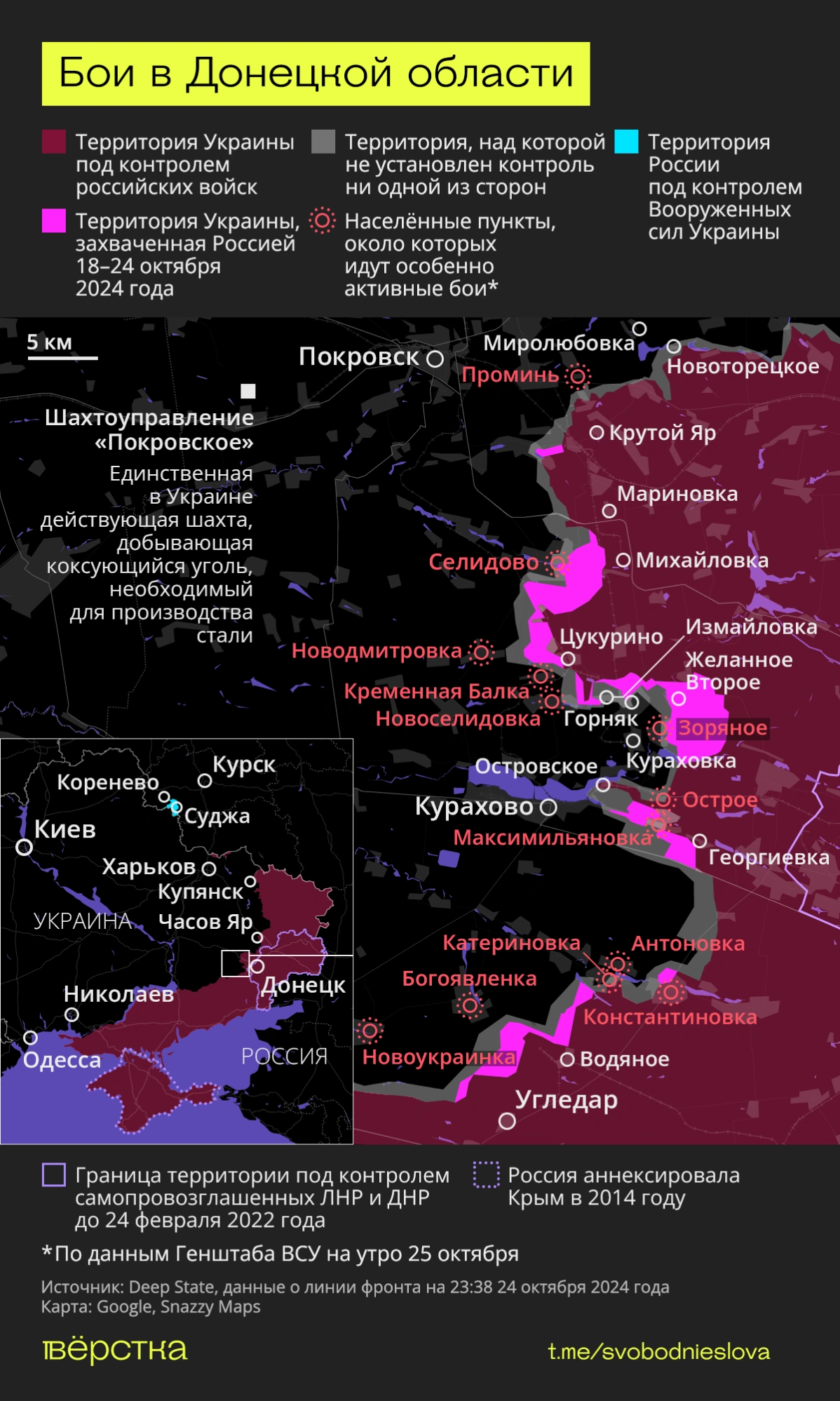На покровском направлении российские военные вошли в город Селидово, который до этого оказался в полукольце. За несколько дней с 22 по 24 октября ВС РФ значительно продвинулись на востоке города, двигаясь со стороны села Михайловка, и на северо-западе от соседнего посёлка Цукурино, после этого начался штурм Селидово. Сейчас в городе идут бои. Российские провоенные телеграм-каналы распространили видео с российским флагом на одной из многоэтажек, которая расположена в южной части Селидово.
