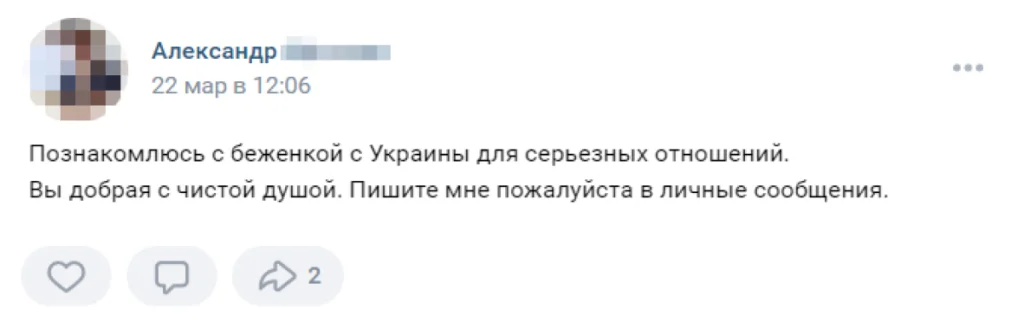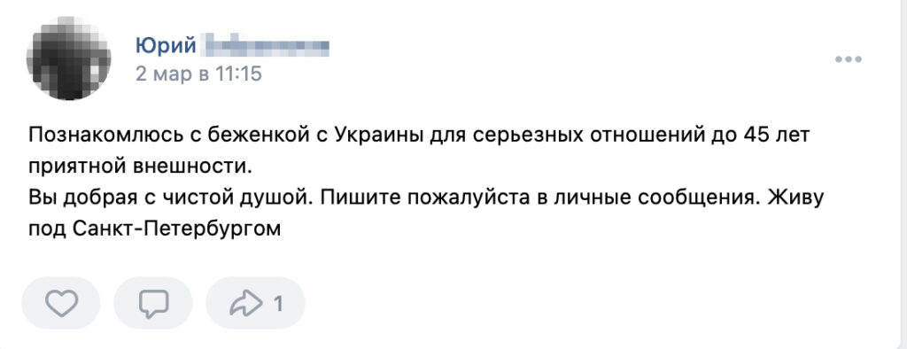 The posts showed up in both regional groups, such as «Settlers and Refugees in Kaluga» and «Helping Refugees in Saint Petersburg,» and in national online communities. In one popular group, called «Ukrainian Refugees,» which boasts nearly a thousand members, the first ads appeared in late February. In May, twenty-two men had authored posts offering to help Ukrainian women.