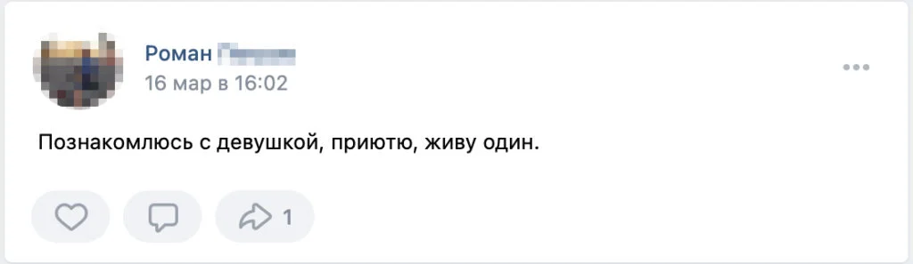 A 31-year-old man from Taganrog, addressing himself as Vikentiy, wrote in a group called «Helping Refugees in Saint Petersburg» that he was ready to help «a slim girl.» He told us that he lived in a studio but was planning to buy a bigger home for himself and his future spouse, and was looking for a Ukrainian partner.