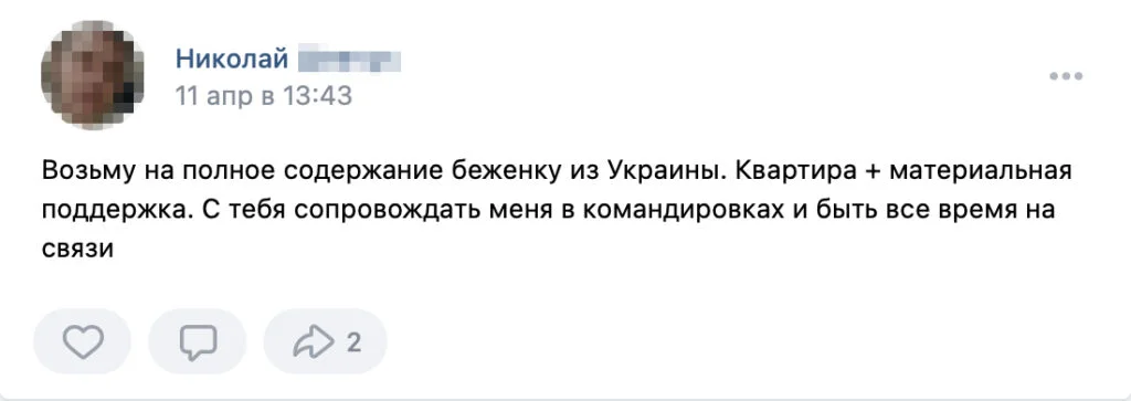 Other Ukrainian refugees, like Maria, who sought help online told Verstka they had seen ads written by Russian men, too, and received messages from them. Twenty-five-year-old Irina says she was evacuated to Saint Petersburg when she was three months pregnant. In early May, she inquired with a group called «Helping Refugees in Saint Petersburg» about buying a transport card. In her post, Irina explained that she couldn’t find a job without a registration, so she had to spend hours walking around the city (she couldn’t afford public transportation) to collect all the necessary documents. In response to her post, Russian men invited her to live with them in exchange for cooking and cleaning. «Not all of them wanted a relationship,» she said. «Still, it was scary. I am alone and pregnant. I don’t want to take a risk living with men I don’t know.»