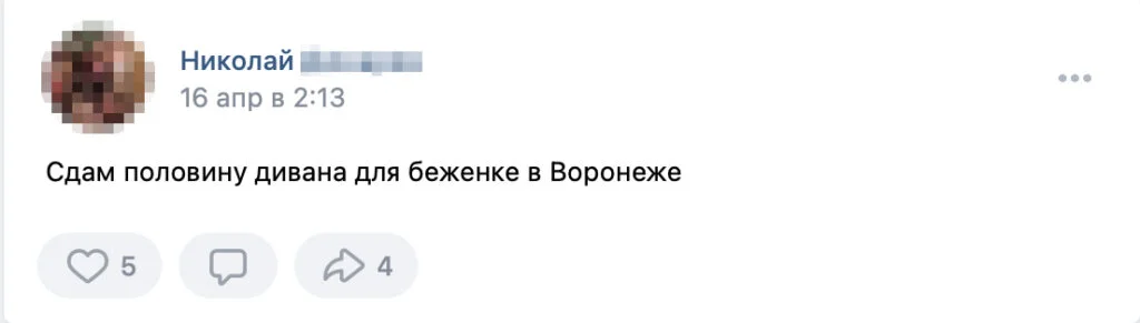Oleg from Volgograd wrote to Verstka saying he posted in several groups offering to house a Ukrainian refugee, but all he got in response were money requests. He’s sure they were all scammers. «No one who really needed help responded,» he said, «just those who make money by begging.» He was upset. «I have an apartment, a house, and no kids. I thought someone would want to come and live with me.» At the same time, he says he’s not ready to help refugees with relocation expenses. «If you don’t even have the money to buy a ticket, there’s no point in going to another country.»
