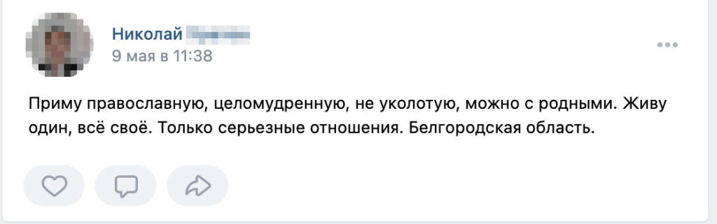 Verstka also uncovered two smaller groups solely for dating female refugees: «I Want to Marry a Ukrainian Refugee» and «A Ukrainian Refugee Needs Help.» Some of the posts in these groups get right to the point: «Will marry a Ukrainian refugee,» «Offering half of a couch for a Ukrainian refugee in Voronezh,» and «Can I have refugees too?» Others are more informative, containing detailed descriptions of the writer and his material status. One from Sverdlovsk Oblast alludes to a «kind and divorced» man. A 32-year-old resident of Murmansk Oblast describes himself as an «adequate, calm, cool-headed, hard worker.» A single, 42-year-old author from Saint Petersburg looking for «a Ukrainian refugee with kids» promises to send his photo in a private message.