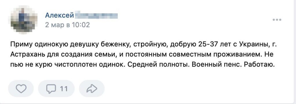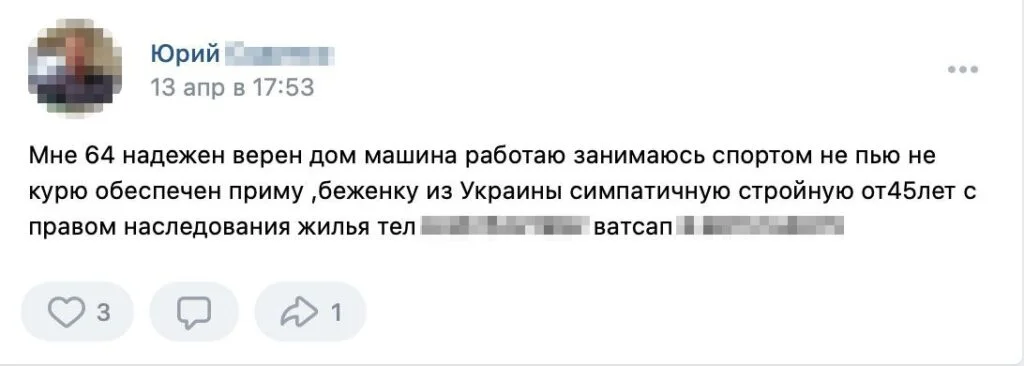Since the beginning of the Russian invasion of Ukraine, hundreds of ads offering to help Ukrainian women have cropped up on the Russian social media network, VKontakte. Written predominantly by men, the ads promise housing for Ukrainian women and girls in exchange for a sexual partner, a spouse, or a housekeeper. Verstka spoke with dozens of authors of the ads to learn their stories and find out why they posted on social media.