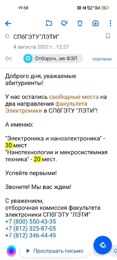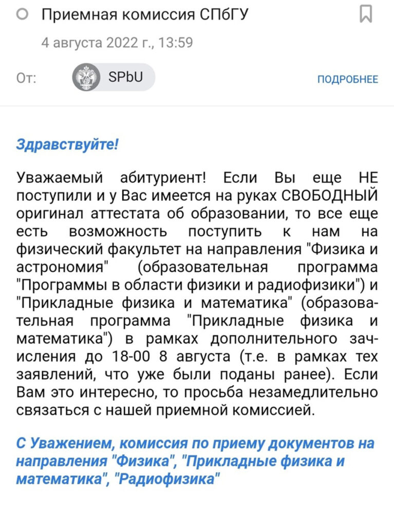 Как рассказали «Вёрстке» абитуриенты, дополнительный набор уже идёт вовсю. Помимо объявлений на сайтах и в соцсетях, вузы присылают выпускникам письма на почту, где зазывают их к себе. Например, в СПбГУ 4 августа были свободные места на физическом факультете, а в СПбГЭТУ «ЛЭТИ» — 50 мест на факультете электроники.