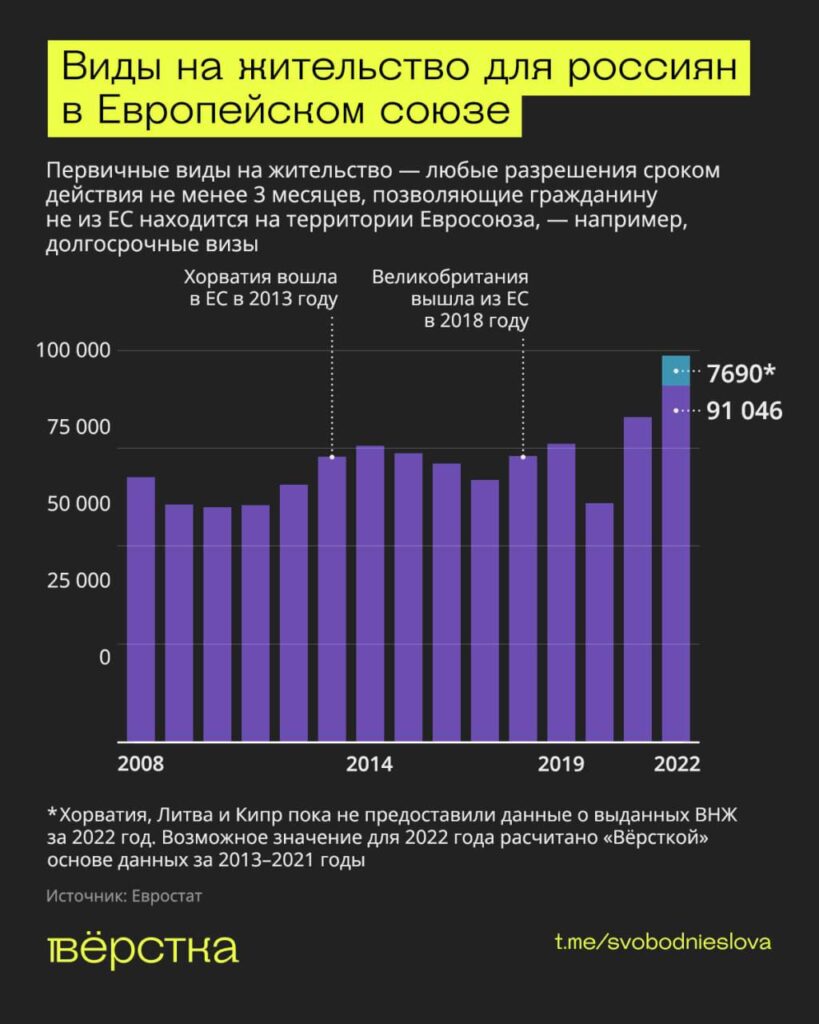 Статистику по выданным видам на жительство пока что не предоставили Хорватия, Литва и Кипр. В предыдущие девять лет (этот отрезок взят, поскольку Хорватия вошла в Евросоюз в 2013 году) доля этих трёх государств в предоставленных россиянам ВНЖ составляла 5,9% от всех остальных стран ЕС. Таким образом, потенциальное число видов на жительство для граждан России от этих государств в 2022 году может быть на уровне 5,5 тысячи, а общее количество первичных ВНЖ от стран Евросоюза в году может достигать 99,6 тысячи.