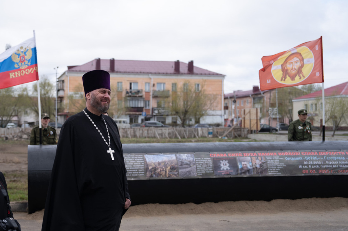 В Омской области возле кафедрального собора установили копию трубы, по которой российские военные проникли в Суджу во время операции «Поток»