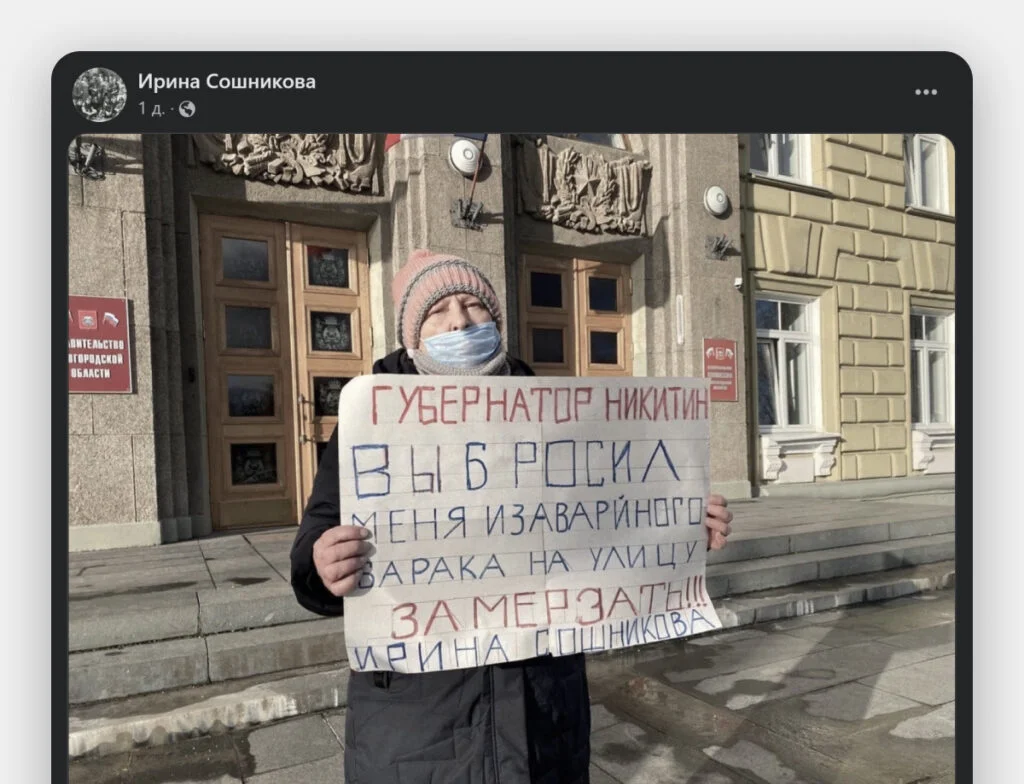 Сошниковой 64 года, она живёт в посёлке Лычково, в старом деревянном бараке без горячей воды и с дровяным отоплением. Пока Ирина работала, а её мама была жива, пенсии и зарплаты было достаточно на жизнь и на покупку дров. Сейчас Сошникова и сама на пенсии, а её мамы нет в живых. Денег на отопление больше не хватает.