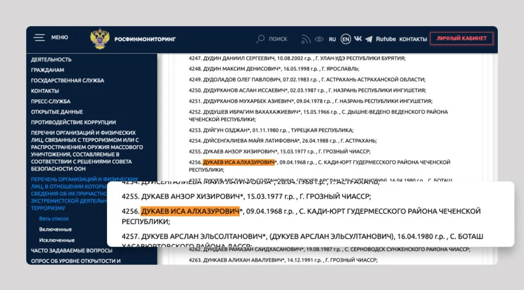 В списке добровольцев, обнародованным ГУР, под номером 1017 оказался соратник Шамиля Басаева — 54-летний Иса Дукаев из Чечни. В перечне террористов Росфинмониторинга он находится под номером 4256.