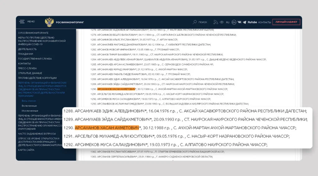 Ещё один оказавшийся в перечне Росфинмониторинга доброволец — 33-летний рецидивист Хасан Арсаханов. В этом перечне он находится как минимум с 2011 года.