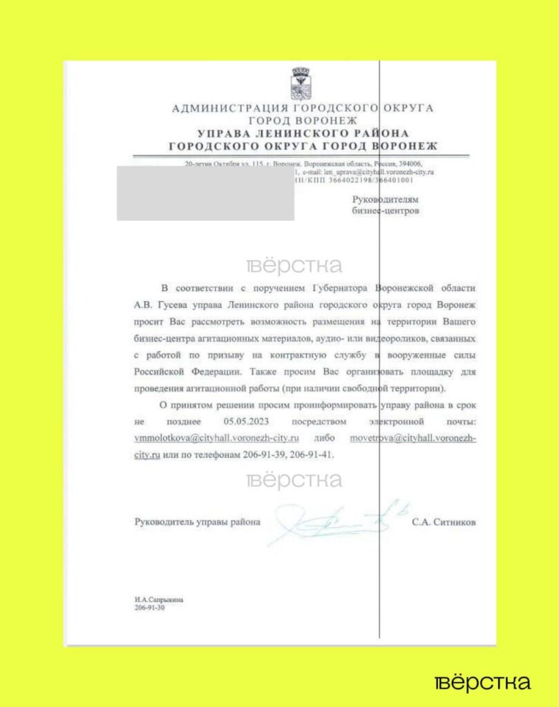 Глава управы Ленинского района Воронежа Сергей Ситников просит руководителей бизнес-центров «рассмотреть возможность» размещения на их территории «агитационных, аудио и видеороликов, связанных с работой по призыву на контрактную службу» в российские вооруженные силы. Кроме того, Ситников «при наличии свободной территории», предлагает администрациям центров «организовать площадку для проведения агитационной работы». Ответа он требует до 5 мая, а в своих действиях ссылается на поручение губернатора Александра Гусева, отвечающего от лица гражданских властей региона за набор новых контрактников в войска.