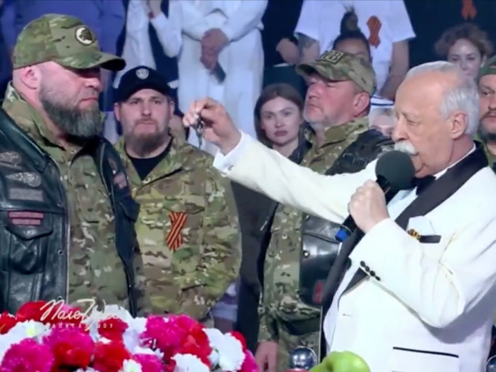 После этого военные вышли к ведущему и развернули знамёна «Пятнашки». «Дождь» опознал среди них Андрея Мищенко с позывным «Голливуд» — он командует подразделением «Ночные волки Пятнашка».