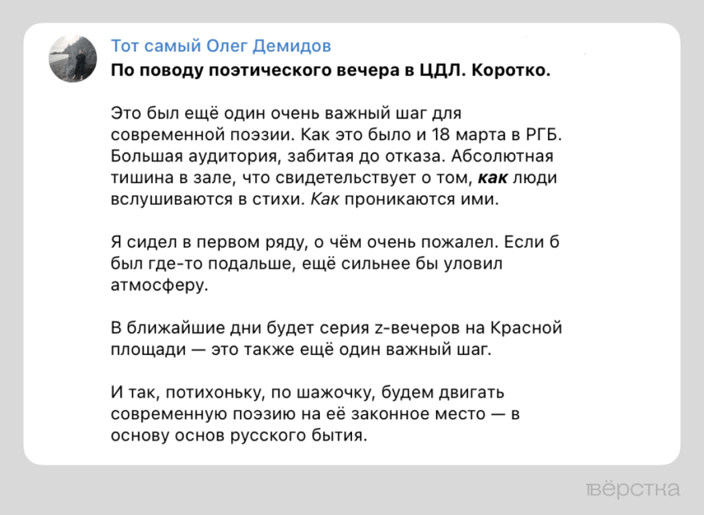Z‑поэты очень активны онлайн: они постоянно делятся текстами друг друга, регулярно анонсируют своё участие в тех или иных встречах и мероприятиях, обсуждают прошедшие выступления, и может показаться, что их популярность очень быстро набирает обороты, а их творчество и выступления — хорошо оплачиваются. За комментариями «Вёрстка» обратились к этим поэтам и участникам книжного рынка.