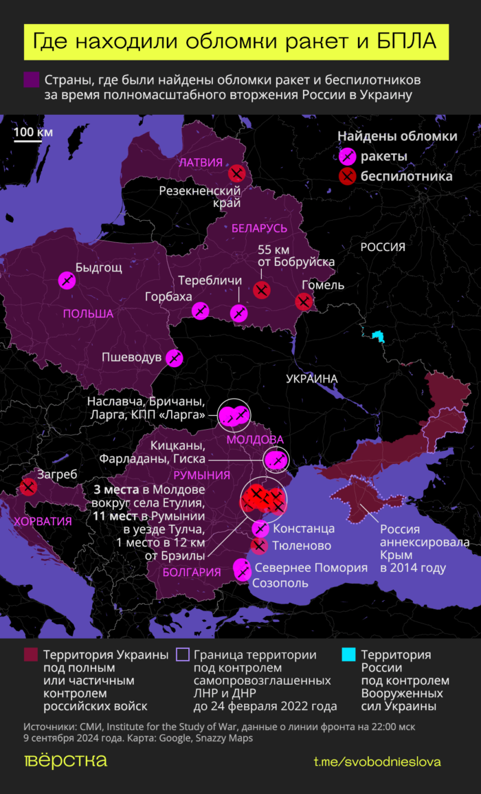 За время полномасштабной войны в Украине обломки беспилотников и ракет не менее 34 раз находили на территории семи соседних стран, подсчитала «Вёрстка». Так, в 2022 году обломки находили семь раз, в 2023‑м — 16, а за неполные девять месяцев 2024-го — 11.