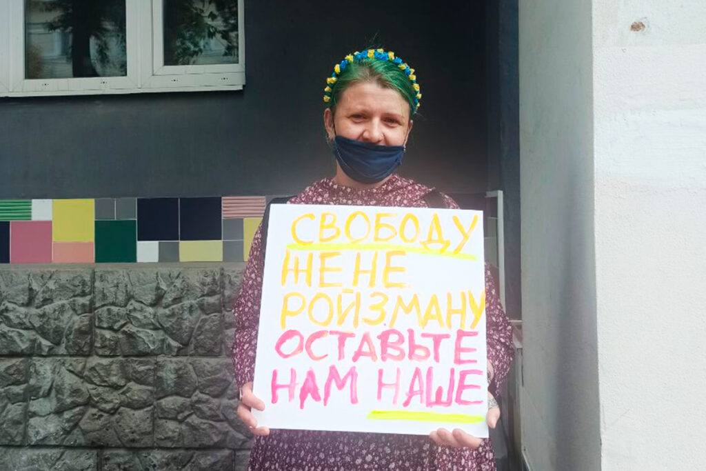 Пока Евгений Ройзман находится в «Невьянской иконе», у входа в Музей проходит одиночный пикет. Девушка с венком в жёлто-голубых цветах стоит с плакатом: «Свободу Жене Ройзману. Оставьте нам наше». К ней подходит пожилая женщина: