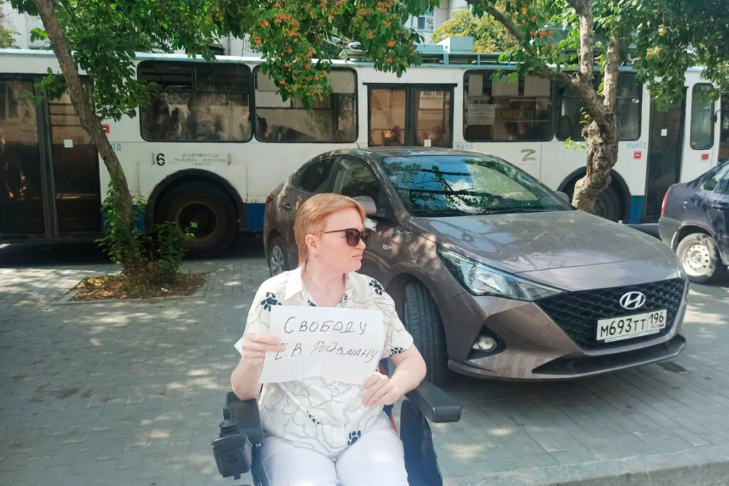 Рядом с первой пикетчицей появляется женщина в инвалидной коляске — это Наталья Туркеева, у неё СМА. Она тоже вышла на пикет, чтобы поддержать Ройзмана. К ней подходят полицейские и настаивают, чтобы она отъехала подальше, иначе её задержат за «несанкционированное массовое мероприятие», так как она находится слишком близко к девушке с плакатом.