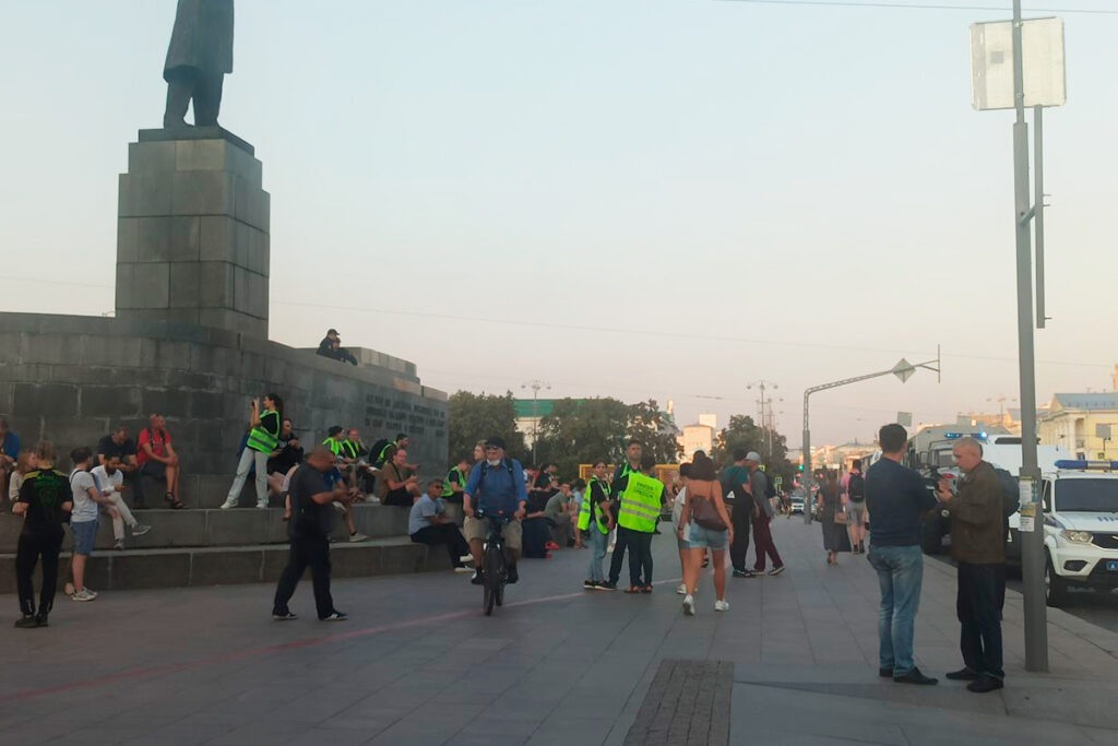 В центре площади образуется стихийный молчаливый протест. Десятки людей мрачно садятся на ступеньки у памятника Ленину. Сергей, сотрудник Школы Астрономии, говорит, что приехал сюда на велосипеде.