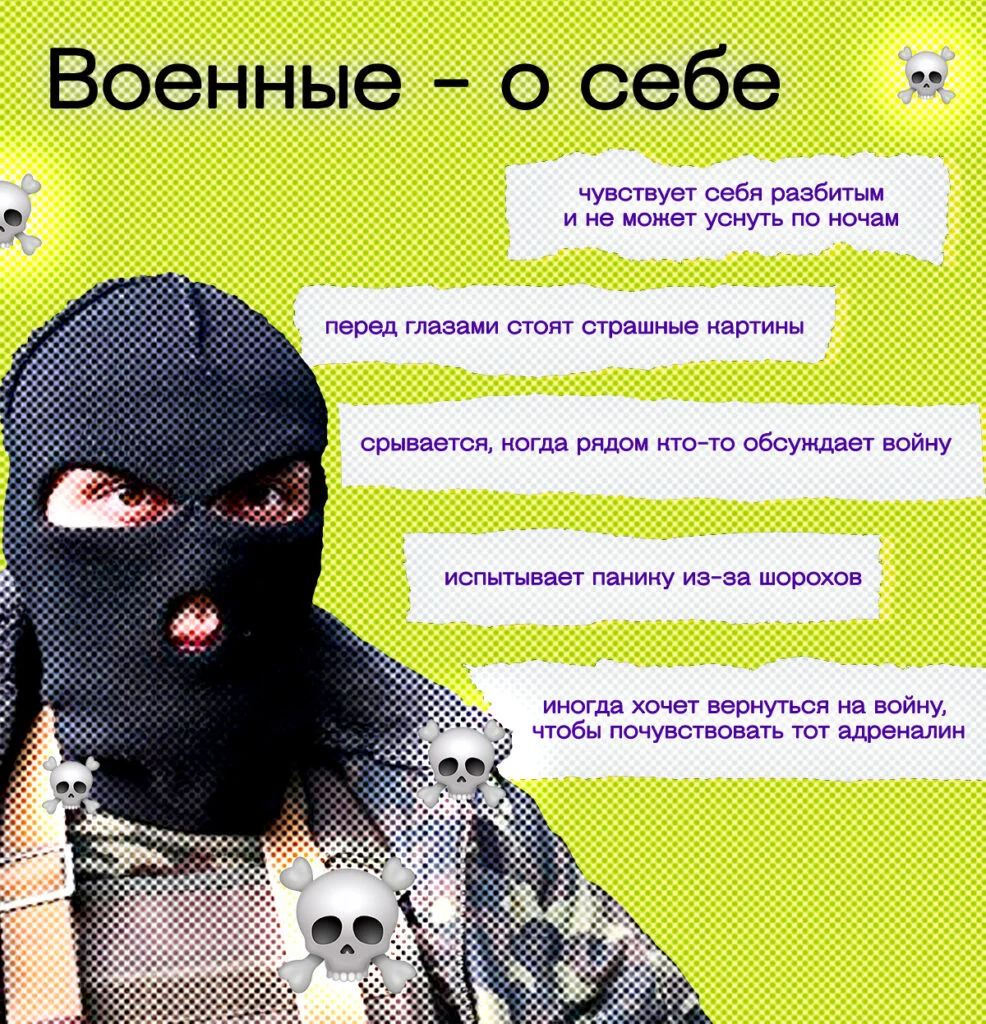 «В сбалансированном здоровом эмоциональном состоянии не может хотеться туда, где тебя могут убить или где тебе придётся убивать, — говорит он. — Но людям с определённым опытом и трудностями может быть в каком-то смысле проще находиться в военной обстановке. Там понятно, где свои, а где чужие, что делать, как обеспечить собственную продуктивность, эффективность, безопасность даже. Возвращаясь домой, военный попадает в среду, где огромная конкуренция, где всё меняется и вообще непонятно, как жить и как чувствовать свою значимость и ценность».
